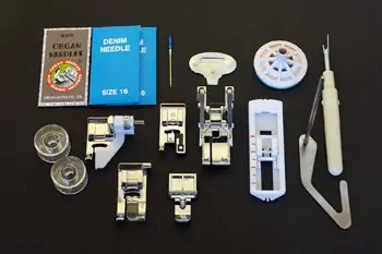 6 stopica (osnovna,stopica za skriveni porub, overlok stopica,stopica za rupice, stopica za rajsferšlus, specijalna stopica za šivenje džinsa),bobine(x2),igle,T-šrafciger, paralica, držač konca, vodič poruba, navlaka.