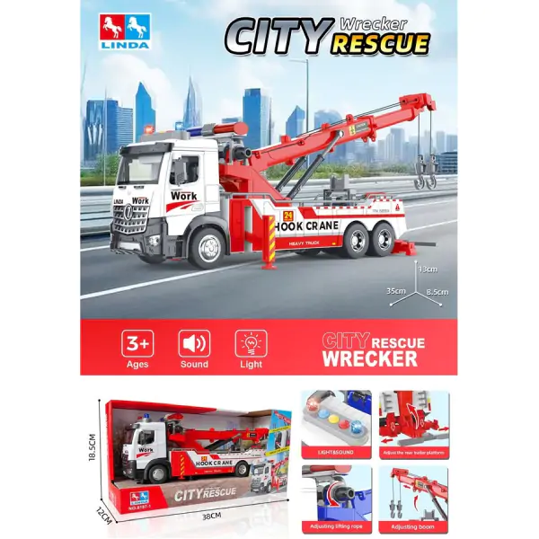 • Funkcije: Pokretni kran (podesiva sajla za podizanje), podesiva zadnja platforma, svetlosni i zvučni efekti