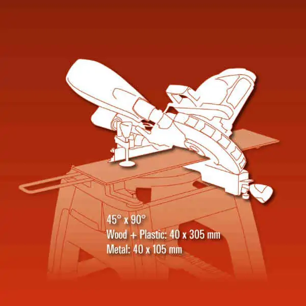 • Širina sečenja 90 ° x 45 ° 305 x 45 mm