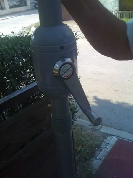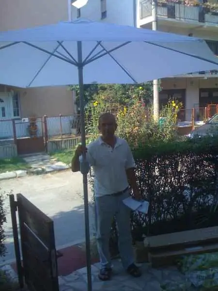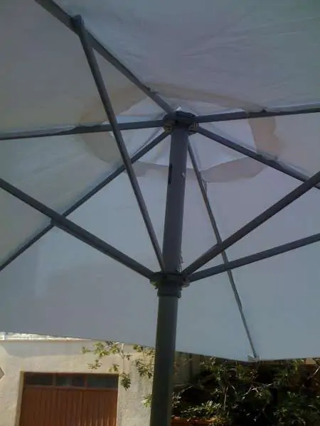 • Kvalitetan i prelep suncobran sa aluminijumskim stativom i platnom u beloj boji, sa otvorom za ventilaciju i sa čekrkom za otvaranje suncobrana.