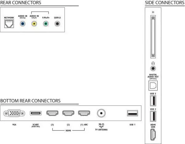 • Antenski IEC75 (75Ω), 3xHDMI (in), VGA D-sub (in), 2xRCA (1x video komponentni (in) (YPbPr), 1x audio (in)), SCART, USB 2.0 tip A, RJ-45, 2x3.5mm (audio in, servisni priključak)