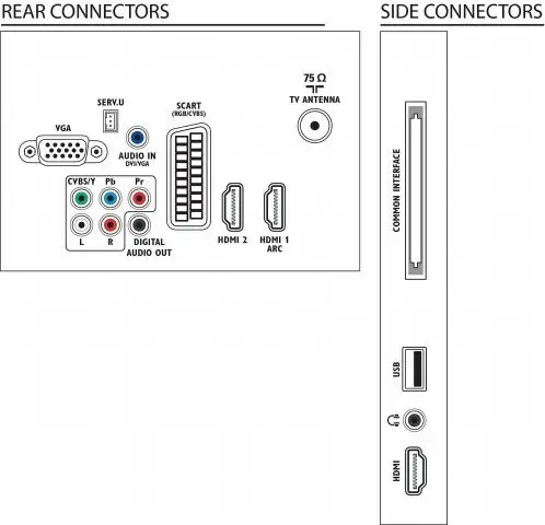 • Antenski IEC75 (75Ω), 2xHDMI (in), VGA D-sub (in), 5xRCA (3x video komponentni (in) (YPbPr), 2x audio (in)), SCART, S/PDIF koaksijalni (out), 3.5mm audio (in), servisni priključak