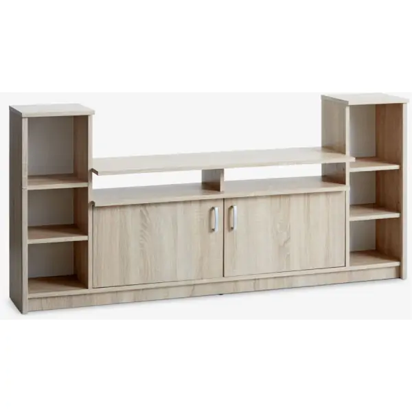 • TV komoda u svetlom hrastu, dimenzija 175 x 85 x 35 cm, izrađena je od kombinacije melamina, medijapana i HDF ploča, pružajući moderan izgled i stabilnost. Namenjena je za samostojeće postavljanje i sadrži dvoja vrata i četiri police, koje omogućavaju praktično odlaganje audio i video uređaja, knjiga i drugih predmeta. Isporučuje se u dva paketa, ukupne težine 41 kg, sa maksimalnim opterećenjem od 15 kg, i potrebno je montirati je.