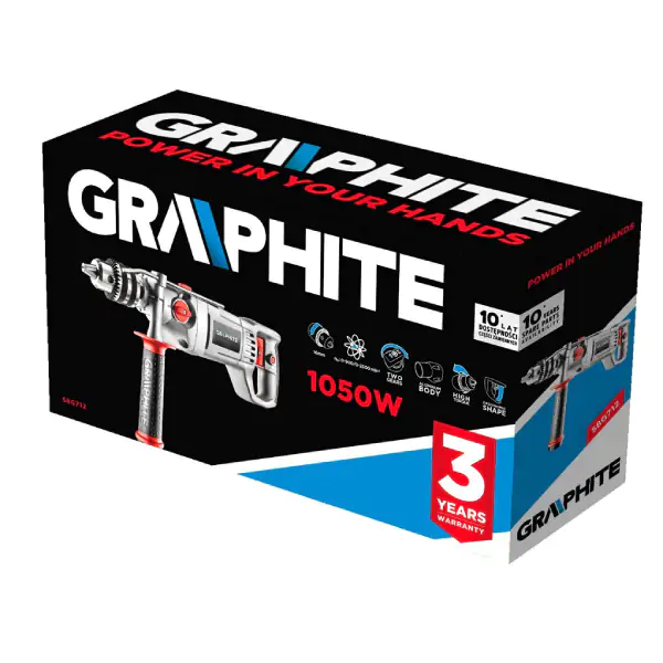 Dvostepena udarna bušilica GRAPHITE od 1050 W je snažan i svestran alat za profesionalno bušenje u drvetu, metalu, keramici, plastici, b ...