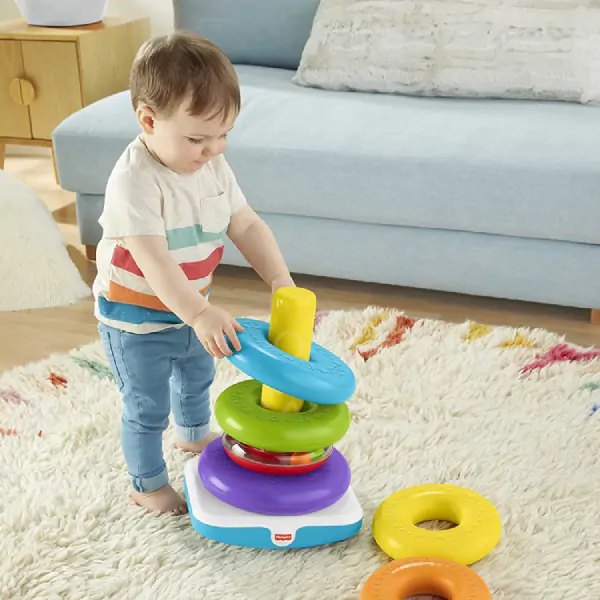 • Ova velika Fisher-Price piramida donosi mališanima sate zabavne i edukativne igre, pružajući savršen uvod u svet boja, oblika i veličina. Šest šarenih prstenova u različitim bojama (crvena, plava, žuta, zelena, narandžasta, ljubičasta) lako se hvataju, tresu i slažu, pomažući deci da uče redosled od najvećeg ka najmanjem i obrnuto. Manji prsten sa kuglicama unutra pruža dodatnu zanimaciju – kada ga dete protrese, čuje se zveket kuglica što podstiče radoznalost i senzornu igru. Kroz slaganje prstenova, deca razvijaju finu motoriku (hvatanje, držanje, postavljanje), koordinaciju oka i ruke i prostornu orijentaciju. Posebno dok pokušavaju da stoje i ubacuju prstenove na postolje, vežbaju i ravnotežu i stabilnost, što je važno za mališane koji uče da hodaju. Postolje je stabilno i široko, tako da se ne prevrće lako, a prstenovi su glatki i bezbedni za male ruke. Piramida je izrađena od čvrste, kvalitetne plastike, bez oštrih ivica. Savršena igračka za prve korake u učenju kroz igru i istraživanje sveta oko sebe – boje, veličine, zvukovi, sve na jednom mestu. Preporučuje se za decu od 12 meseci naviše.