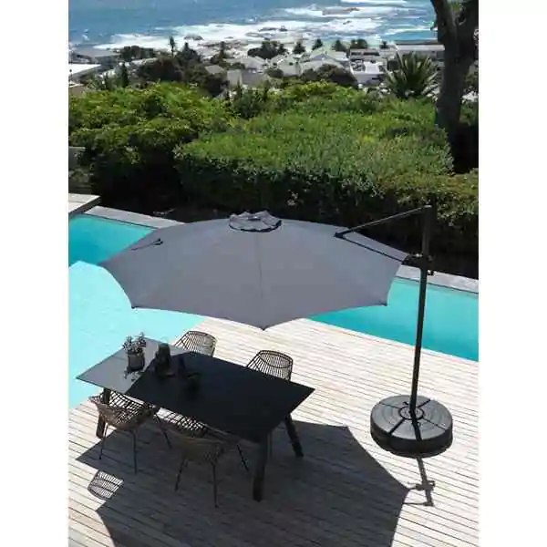 • Viseći suncobran TRONDHEIM prečnika 300 cm pruža izuzetnu zaštitu od sunca i lagane kiše, a savršen je za terase, bašte, balkone ili uz bazene. Zahvaljujući nagibnom mehanizmu i ručici za otvaranje, lako se podešava u željeni položaj, dok ventilacioni otvor na vrhu osigurava stabilnost i sprečava podizanje pri jakom vetru.