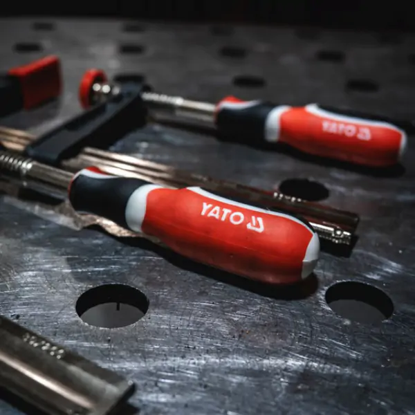 • YATO stolarska stega F-tipa dimenzija 500/120 predstavlja vrhunski alat dizajniran za zahtevne stolarske i montažne radove, gde je neophodna maksimalna stabilnost i snažno stezanje srednjih i velikih radnih komada. Njeno telo, konstruisano od debelih i stabilnih šina sa dodatnim ojačanjima, pruža izuzetnu otpornost na savijanje i torziju pod intenzivnim opterećenjem, čime se obezbeđuje sigurno i pouzdano fiksiranje i poravnavanje. Vijak sa posebno izrezbarenim navojem, zajedno sa ojačanim profilom ruku, garantuje glatko i moćno stezanje, dok je ergonomska drška obložena mekim tehničkim materijalom za udobniji i snažniji hvat, smanjujući zamor tokom rada. Ključnu funkcionalnost za očuvanje kvaliteta obrade pruža pritisna ploča montirana na kuglastom zglobu, koja se automatski prilagođava uglu površine, i mekane plastične obloge koje štite finu površinu drveta od oštećenja i ostavljanja tragova. Ova robusna i svestrana stega je neophodna u svakoj profesionalnoj stolarskoj radionici, fabrici nameštaja ili montažnoj hali, gde se ceni dugotrajnost, preciznost i zaštita kvaliteta finalnog proizvoda.